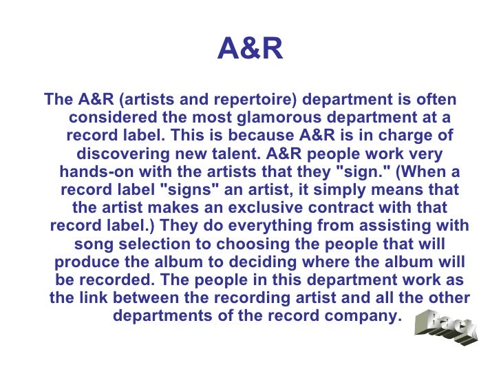 Music Business Hierarchy chart | Hierarchystructure.com Let's look at this hierarchy in detail: Chief Executive Officer (CEO) The CEO is the highest level executive of a music business and is the one who takes all the major decisions and sets all the goals for the company and its workers to follow. President What is the structure of a record label? - Quora Answer (1 of 3): They are all different, based on their size, with many people wearing different hats at the small ones, and large departments for each role in the big ones. Basically, there are many functions of a record company that may or may not be done by the record company depending on who... Structure Of A Major Record Label - SlideShare Structure of a major record label 2. A&R The A&R (artists and repertoire) department is often considered the most glamorous department at a record label. This is because A&R is in charge of discovering new talent. A&R people work very hands-on with the artists that they "sign." Record label - Wikipedia From 1988 to 1998, there were six major record labels, known as the Big Six: [3] Warner Music Group EMI Sony Music (Known as CBS Records until January 1991) BMG (Formed in 1984 as RCA/Ariola International) Universal Music Group (Known as MCA Music until 1996) PolyGram