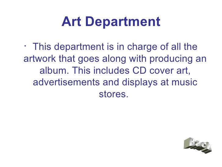 Record label structure - SlideShare THE MARKETING DEPARTMENT The department is in charge of creating marketing plans for every album that the record label plans to release. A basic marketing plan will obtain the coordination and help of the promotion, sales and publicity departments. 8. NEW MEDIA DEPARTMENT This department can be seen as a 'new' addition to the modern record ...