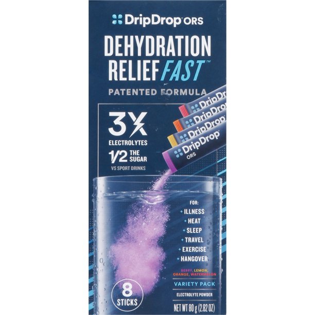 DripDrop ORS Electrolyte Hydration Powder Sticks, Berry, 10g Sticks, 8 ... DripDrop is a great-tasting solution available in 3 flavORS that, when mixed with water, delivers 3x the electrolytes of sports drinks and 1/2 the sugar of sports drinks. The patented solution delivers better fluid retention because it is based on Oral Rehydration Therapy (ORT). Product details Is Discontinued By Manufacturer : No