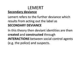 Difference Between Primary and Secondary Deviance In primary deviance, the person commits a deviant action without knowing that h/she is going against the norm system. However, in secondary deviance, the person is already labeled as a deviant but still h/she continues to engage in that particular act. Now, we will look at these two terms, primary deviance and secondary deviance, in detail. Neutralization Theory - Criminology - Oxford Bibliographies - obo Sykes and Matza outlined five neutralization techniques: denial of responsibility, denial of injury, denial of victims, appeal to higher loyalties, and condemnation of condemners. Research on the theory has generally produced mixed results, leading many to conclude that the theory is not powerful enough to serve as a stand-alone explanation for ... Truth in Labeling: Are Descriptions All We Have - academia.edu Many descriptions of the LA focus heavily on Lemert's concept of secondary deviance, which often deemed to state, as two randomly chosen con- temporary textbooks put it, that ''crime may be heightened by criminal sanctions'' (Carrabine et al. 2004) and that ''it [is] the imposition of control that essentially 'cause[s ... Sociology: Exam #2 Flashcards | Quizlet Under what circumstances does a deviant label lead from primary to secondary deviance? when there are social or legal sanctions and the deviant label is internalized _____ work is the dominant form of employment in the postindustrial economy. Service