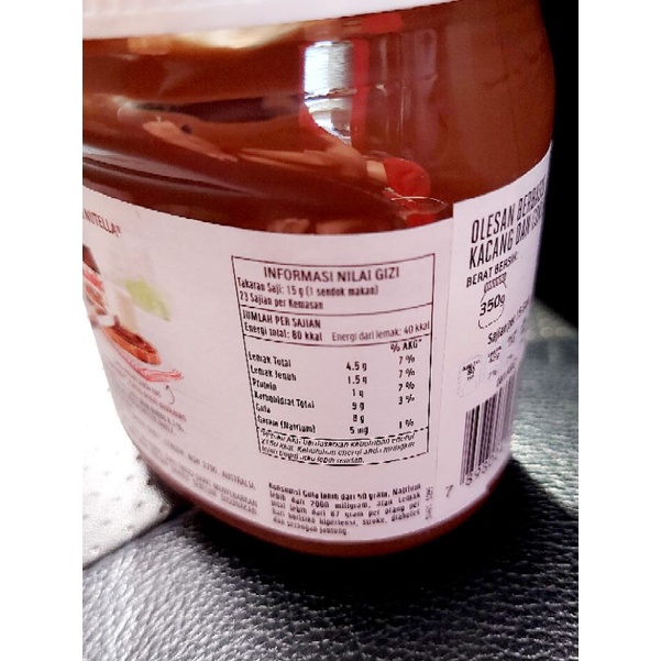 Nutella. The full (correct) list of ingredients To fill in the rest of the detail, here's the part of Nutella nutrition panel from the website which did coincide with the label: Per 100g Energy 2175kJ Protein 7.3g Fat, total 30.3g Fat, saturated 10.0g Carbohydrate, total 54.7g Sugars 54.4g Sodium 33 mg