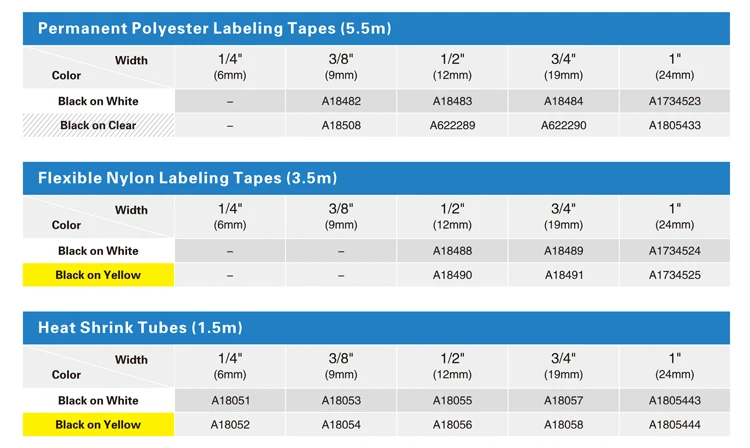 Dymo D1 Tape Guide - PtouchDirect.com A chart divides the D1 tapes into size categories where you can also note the color. With the Dymo D1 Tape Guide, you don't have to wander from page to page looking for the right product. Just click on the tape number and you will be taken directly to the item that you want. Shopping on PtouchDirect is a snap because they understand organization.