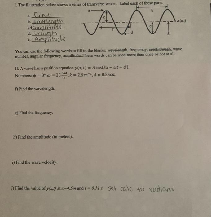 Parts of a Wave Answer Document - Course Hero Label each part in the space provided.a. crest b. wavelength c. amplitude d. trough e. amplitude f. wavelength g. equilibrium position Fill in the blanks: 2. Waves carry energy from one place to another. 3. The highest point on a transverse wave is the crest while the lowest part is the trough. 4. The amplitude is the height of the wave. 5.