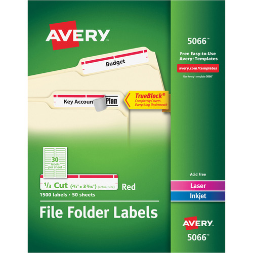 Avery 5066 Permanent Filing Labels, 1/3 Cut, 1500/Bx, Red This item: Avery 5066 Permanent Filing Labels, 1/3 Cut, 1500/BX, Red. $42.29. In Stock. Ships from and sold by MyOfficeInnovations/Staples, Inc.. Get it Aug 31 - Sep 2. Avery Blue File Folder Labels for Laser and Inkjet Printers with TrueBlock Technology, 2/3 inches x 3-7/16 inches, Box of 1500 (5766) $31.21 ($0.02/Count) In Stock.