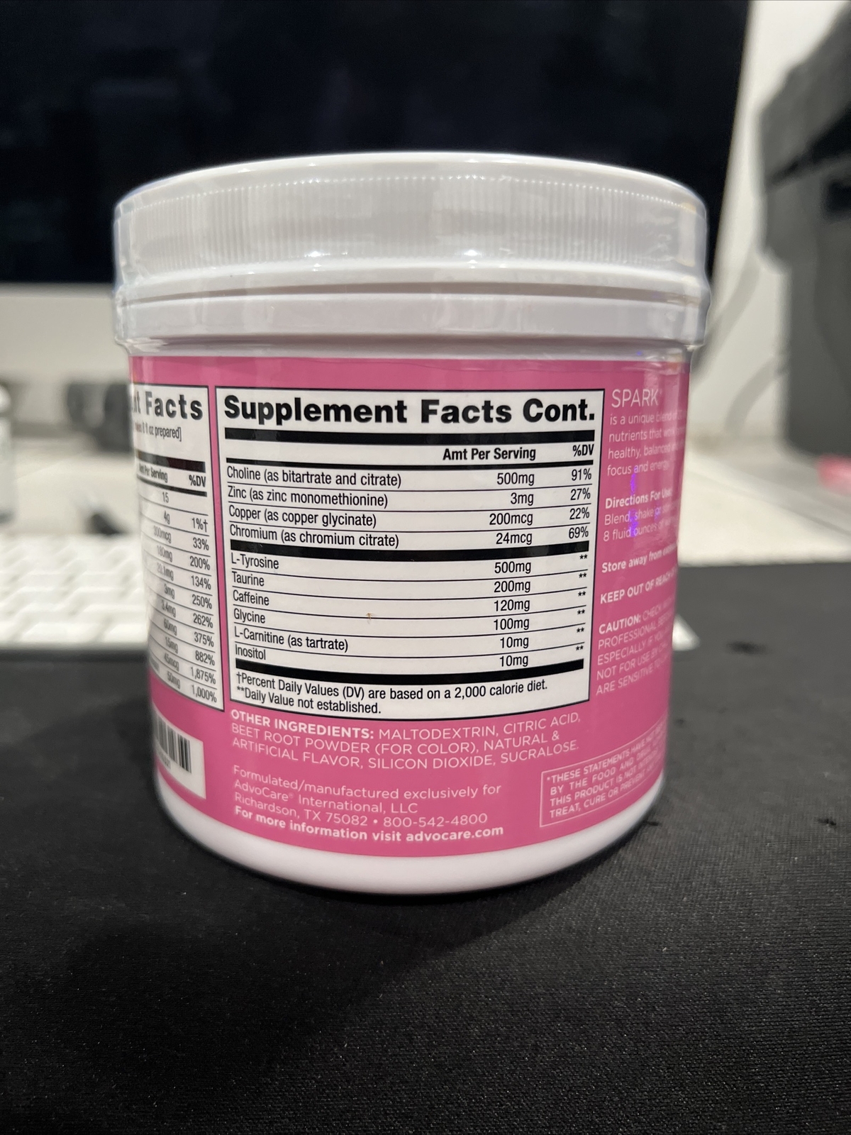 Advocare Spark Nutrition Facts (Complete Research) Advocare Spark energy drink mix contains different ingredients in its formula such as follows. Calories Caffeine Carbohydrates Vitamin A Vitamin C Vitamin E Thiamine Riboflavin Niacin Vitamin B6 Vitamin B12 Pantothenic acid Zinc Copper Chromium Choline L-Tyrosine Taurine Glycine L-Carnitine Inositol Maltodextrin Citric acid Natural flavor