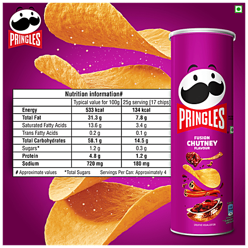 Pringles® Flavors | Pringles® Scorchin' No pain, all gain. With the perfect balance of flavor and heat, Pringles® Scorchin' are the spicy snack you can keep eating, and eating, and eating, and eating, and eating, and... view all scorchin' Wavy Ride the flavor wave with Pringles® Wavy. Amazon.com: Pringles: Grocery & Gourmet Food Online shopping from a great selection at Grocery & Gourmet Food Store. ... Pringles Potato Crisps Chips, Snack Stacks, Lunch Snacks, Office and Kids Snacks, Variety Pack (36 Cups) ... Subscribe & Save. $17.47 $ 17. 47 ($0.67/Ounce) Extra 15% off when you subscribe Extra 15% off when you subscribe. First Delivery Thu, Nov 10. Add ... Pringles® Reduced Fat Original Crisps - SmartLabel™ Pringles® Reduced Fat Original Crisps 00038000165276 Nutrition Ingredients Allergens Features & Benefits Company, Brand & Sustainability 140 Calories 2 g Sat Fat 130 mg Sodium 0 g Sugar Nutrition Facts Servings Per Container About 5 Serving Size About 15 Crisps (28 g) Calories in Original Pringles - Largest Verified Nutrition Database Pringles Serving Size: oz (28g ) Amount Per Serving Calories 153 Calories from Fat 89 % Daily Value* Total Fat 9.9g 15 % Saturated Fat 2.4g 12 % Trans Fat 0.1g Polyunsaturated Fat 4.3 g Monounsaturated Fat 1.7 g Cholesterol 0mg 0 % Sodium 112mg 5 % Potassium 178mg 5 % Total Carbohydrates 16g 5 % Dietary Fiber 0.8g 3 % Sugars 0.2g Protein 1.3g 0%