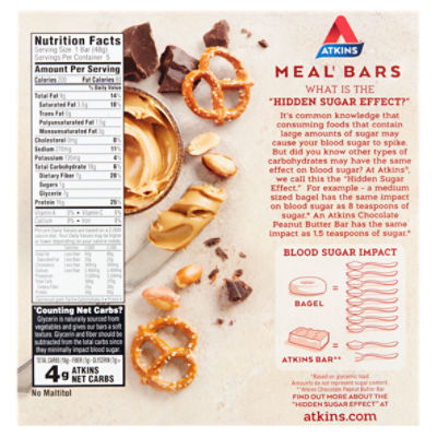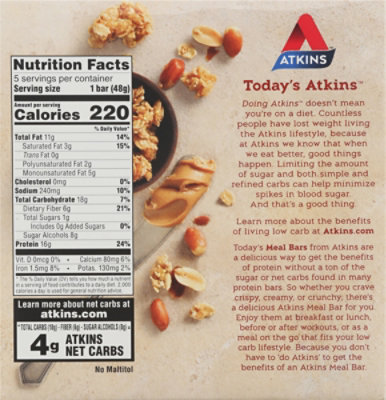 Atkins Protein-Rich Meal Bar, Chocolate Peanut Butter, Keto ... Nutrition facts ; Sodium 260mg, 11% ; Total Carbohydrate 23g, 8% ; Dietary Fiber12g, 43% ; Sugars2g.