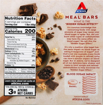 Atkins bars nutrition label. Atkins Nutrition Bars - Strawberry Shortcake - 5pk : Target STAY ON TRACK. Stay true the Atkins Diet and Lifestyle with our delicious meal bars. These layered bars have 3-5 grams of net carbs and 3 grams or less of sugar per serving.*. MEAL BARS AT HOME OR ON-THE-GO. Enjoy a creamy, crunchy, and satisfying meal bar that fits right into your busy schedule. With 13-17 grams of protein and 6-14 grams of ... Atkins - Protein Bar - Chocolaty Almond Caramel - Low Carb Canada Description: · Size: 5 Bars · Nutrition Facts: per 1 bar (48 g) Calories 190, Fat 9 g, Saturated Fat 5 g, Trans Fat 0 g, Cholesterol 0 mg, Sodium 230 mg, ... Chocolate Peanut Butter Bar | Atkins Made with simple, quality ingredients without refined sugars, artificial flavors, color or preservatives. This bar will satisfy your hunger and your taste buds. 16g Protein 2g Sugar 12g Fiber 240 Calories How to Calculate Atkins Net Carbs View full nutritional information Military veteran, service member or first responder? Atkins Protein-Rich Meal Bar Chocolate Chip Granola Bars - 5 ct 17 g protein. 3 g net carbs (Total carbs (18 g) - fiber (7 g) - glycerin (8 g) = 3 g Atkins net carbs) ...