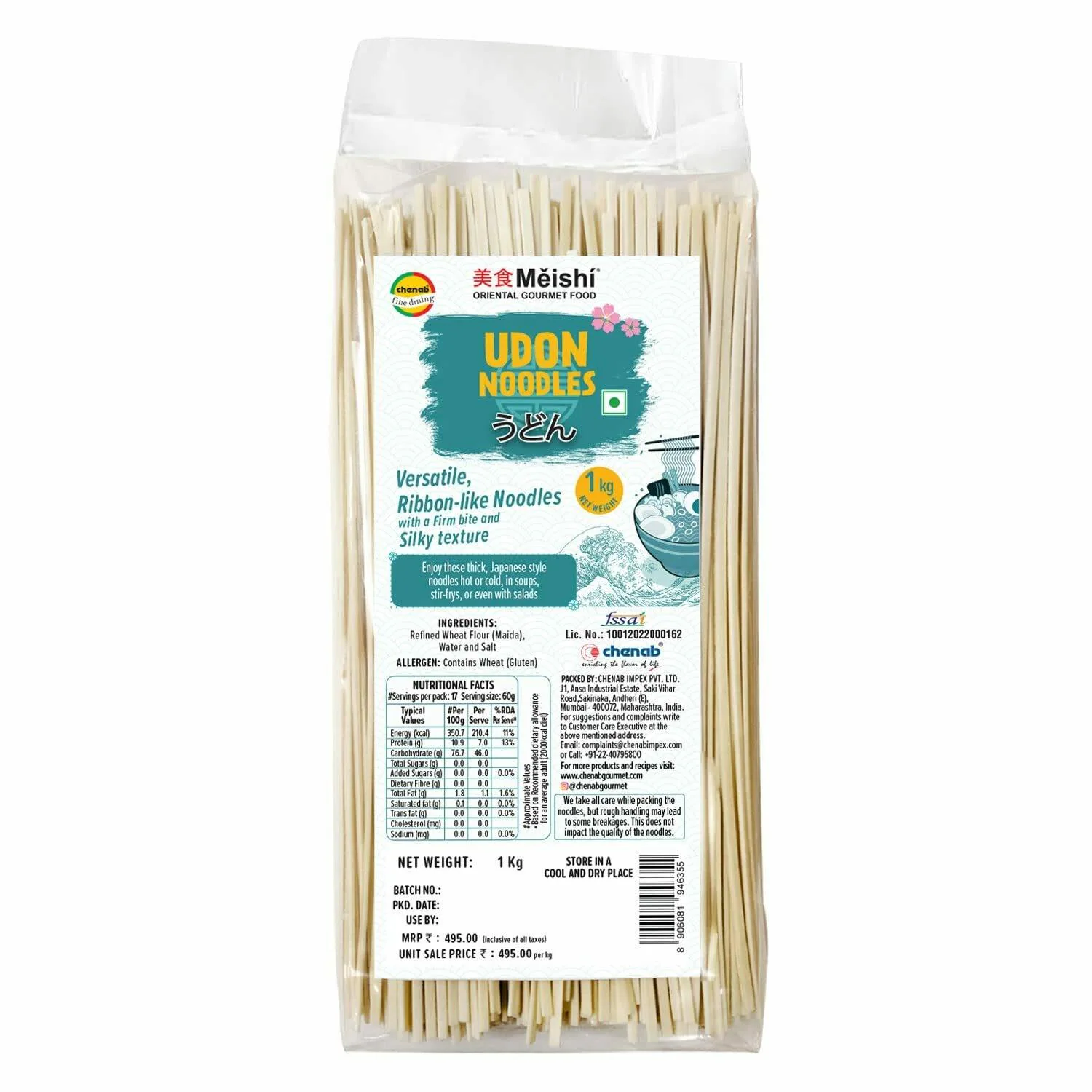 Udon Noodles Nutrition | Healthfully Udon noodles are very low in fat. One serving contains 1 grams of total fat and 0 g of saturated fat. Carbohydrates The primary ingredient of the udon noodle is wheat, making it a high carbohydrate food. Each 2-ounce serving of udon noodles contains 40 grams of carbohydrates and 1 gram of fiber.