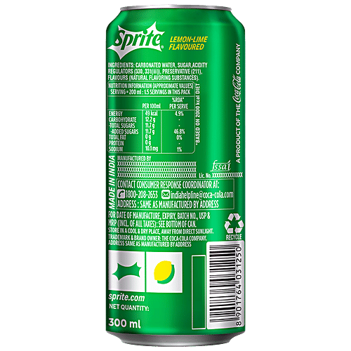 Nutrition Facts for Sprite A pie chart showing the macro nutrient componenets for Sprite. This food consists of 89.79% water, 0.05% protein, 10.14% carbs, 0.02% fat, and 0% alcohol. Calories in Sprite 300ml Can by The Coca-Cola and Nutrition Facts There are 160 calories in can of Sprite 300ml Can by The Coca-Cola from: Carbs 9g, Fat 0g, Protein 0g. Get full nutrition facts for your favorite foods and ...